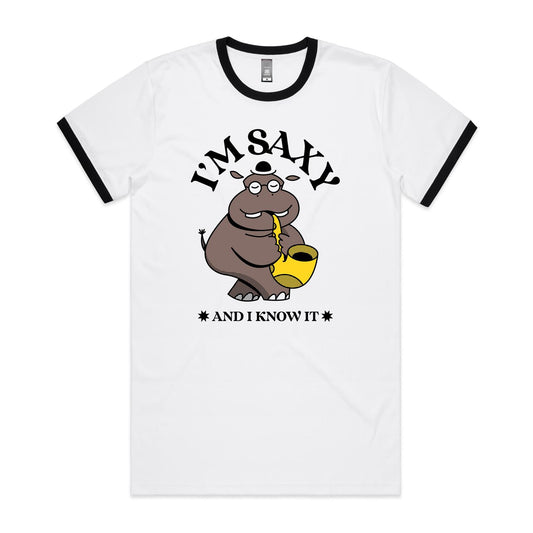 I'm Saxy And I Know It, Hippo Saxophone Player - Staple Ringer Tee I'm Saxy And I Know It, Hippo Saxophone Player - Staple Ringer Tee