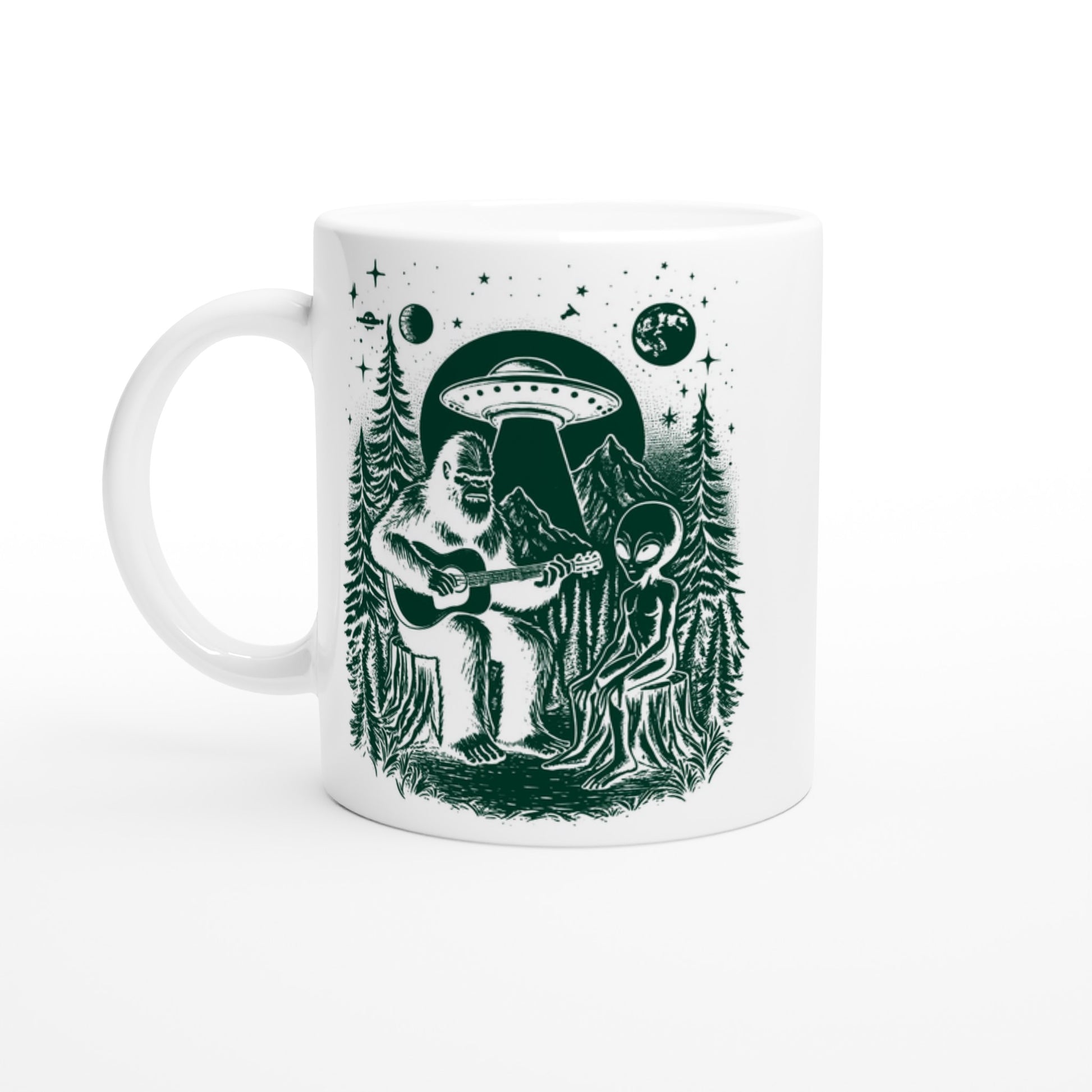 Alien And Bigfoot Play Guitar - White 11oz Ceramic Mug