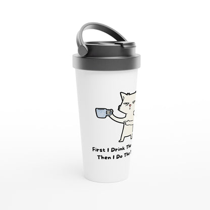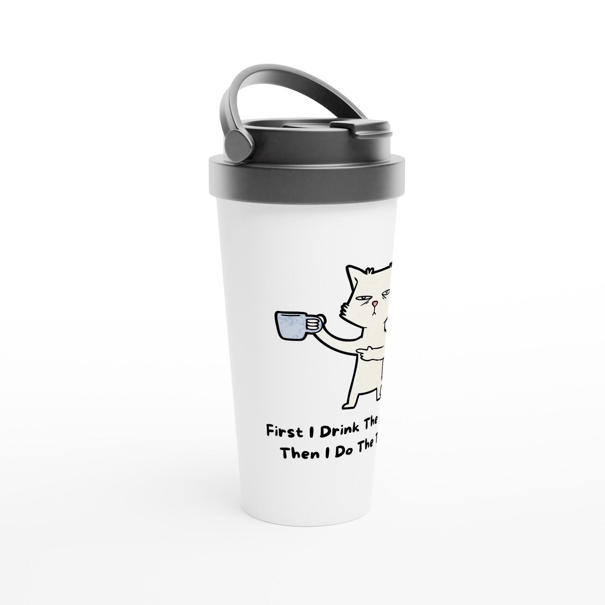 First I Drink The Coffee Then I Do The Things, Cat - White 15oz Stainless Steel Travel Mug