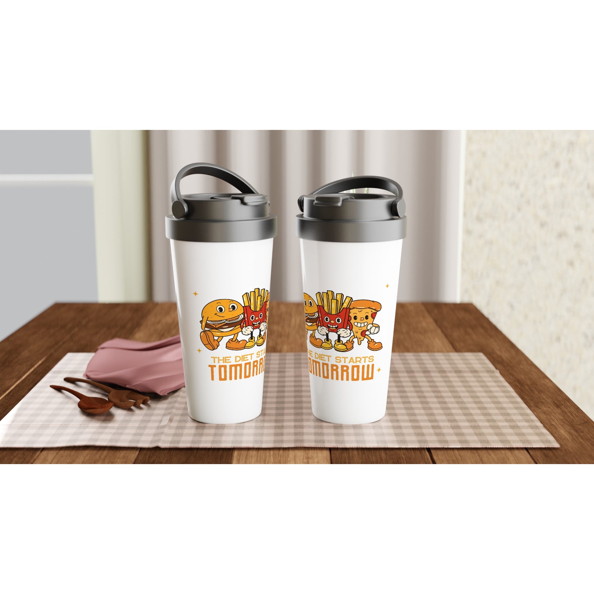 The Diet Starts Tomorrow, Hamburger, Pizza, Fries - White 15oz Stainless Steel Travel Mug
